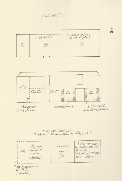 Sur une étendue de terrain de onze journaux ou arpens sont de vastes prairies arrosées par une foule de sources naturelles dont on a tiré le plus grand parti pour toutes les opérations du blanchiment. Les ateliers où l'on travaille, les différents bassins où se lavent les tissus sont disposés au bas du coteau, et sur le plateau on a construit un grand séchoir pour les toiles. Outre le séchoir, on en a disposé un autre de 150 pieds de long, au dessus des chaudières à vapeur. Le grand bâtiment où se trouvent les chaudières est divisé en trois parties. Dans l'une sont les chaudières et les cuviers à lessive, dans l'autre le magasin aux fils, et dans le troisième, trois grands bassins quadrangulaires en gneiss cimenté par le ciment anglais où se font les lavages des fils et des tissus lorsqu'ils sont presque blancs. A côté de ces bassins se trouve l'atelier où se fait le chlore et où l'on passe les toiles à la lessive de chlore. Enfin, en face du grand bâtiment se trouvent plusieurs bassins cantonnés les uns au-dessus des autres et où se pratiquent presque tous les lavages. Il y a en outre des magasins, bureaux, etc.