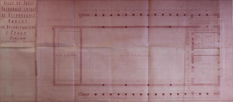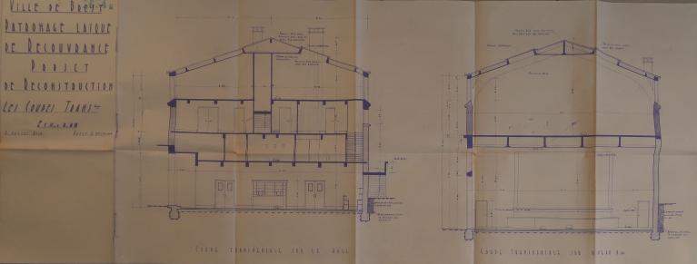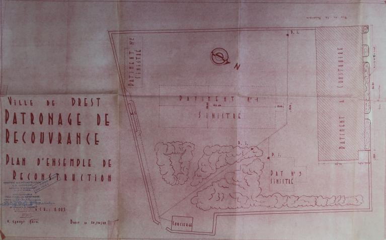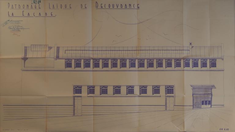 Le patronage laïque de Recouvrance est fondé en 1923 par Jean Julien, instituteur. Le 31 janvier 1949, le conseil municipal charge l'architecte auvergnat Henri Gannat de sa reconstruction. Le permis de construire est délivré le 23 mars 1950 et l'autorisation préfectorale le 27 avril. Le montant des travaux - 30 331 959 F - correspond à celui des dommages de guerre. Le 1er septembre 1951, un arrêté du ministre de l’Éducation nationale, de la Jeunesse et des Sports attribue une subvention de 3 MF à la ville de Brest. Le 1er juillet 1953, le bureau de la Reconstruction indique que "la salle omnisports sera prochainement achevée avec l'exécution des travaux de revêtement de sol". Le certificat de conformité est délivré le 28 décembre 1954. Toutefois, les travaux de second œuvre se poursuivent jusqu'en 1957 et la réception définitive n'a lieu que le 2 avril 1958.