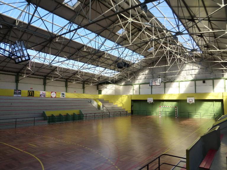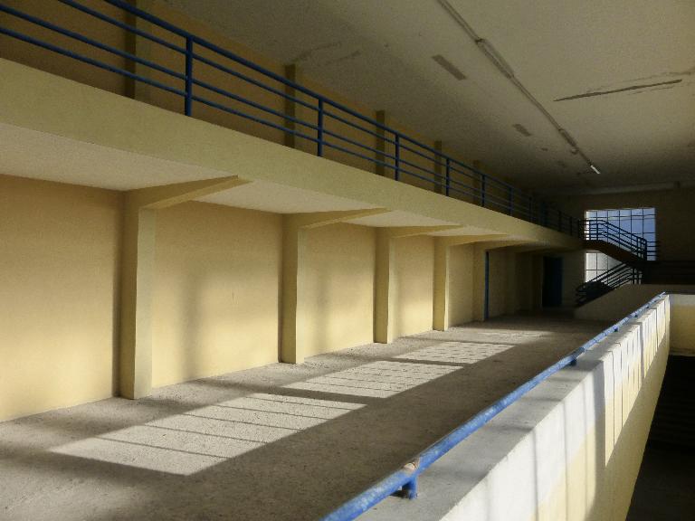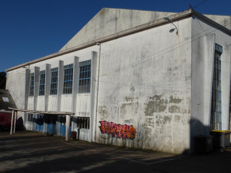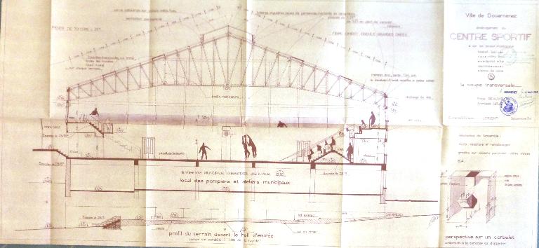 "L’ensemble à aménager est prévu au-dessus et dans une ancienne usine de conserves achetée par la ville et devenue ateliers municipaux et entrepôt de matériel d’incendie." (Arch. dép. Finistère, 78 W 4) La salle à charpente métallique est flanquée de tribunes sur ses deux grands côtés.