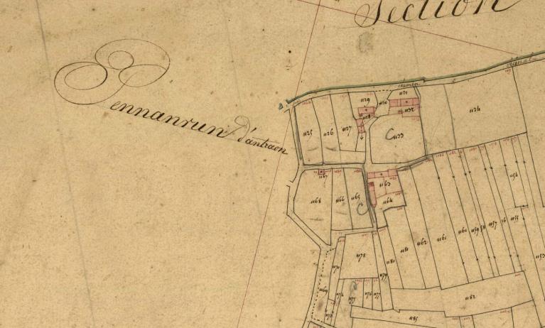 Sur le linteau de la porte d’entrée du logis est inscrite la date de 1822. Il n’est donc pas surprenant de voir la ferme signalée sur le cadastre de la commune de 1836, au nord-est du village de Pennarun d’Antraon.
