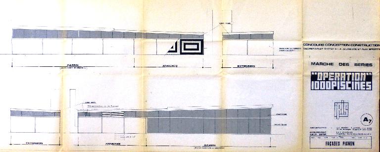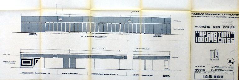Piscine de type Iris issue du concours des "Mille piscines". Bassin de 25 x 10 m. Toiture ouvrante.