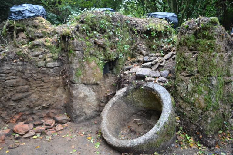 Il contient une cuve complète (cuve et rehausse), une partie d'une autre cuve et un bassin. Ce dernier est complet (bord intérieur constitué d'une dalle de schiste de 3m90 et deux repamoirs en schiste) et fonctionnel (l'eau y circule librement et s'évacue).