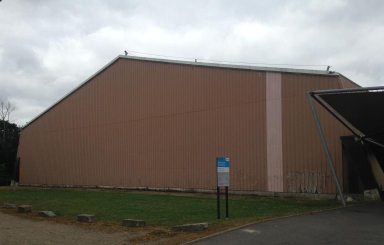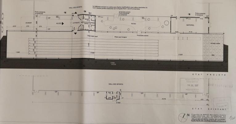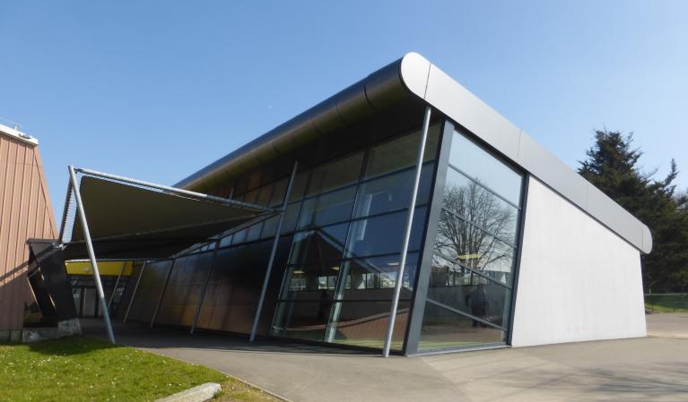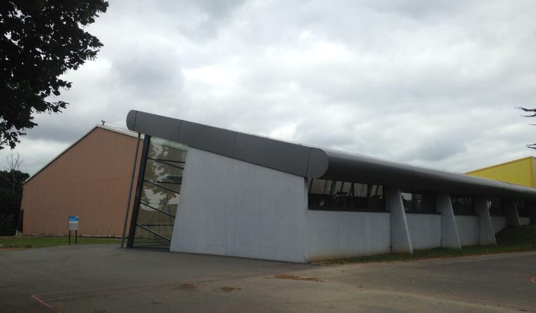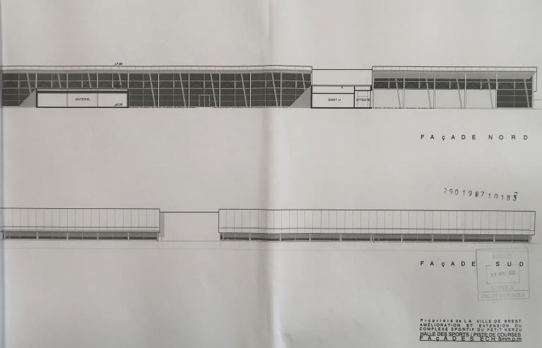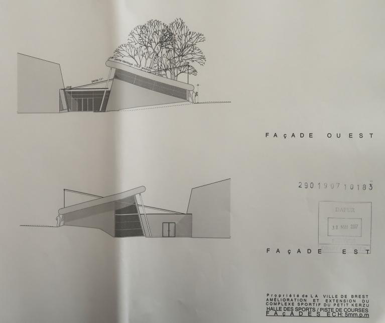 Créé dans les années 1960, le "centre sportif scolaire du Petit Kerzu" a été complété récemment par la construction d'une piste de vitesse couverte de qualité, dont le projet "a avant tout fait l'objet de la recherche d'un volume compatible avec la masse imposante et quelque peu austère du gymnase existant. Aussi avons-nous proposé la création d'un bâtiment monopente dont le traitement de toiture en tôle d'aluminium lisse [...] devient l'élément essentiel de la composition. Tracée en parallèle de la toiture de la grande halle, celle-ci vient mourir contre un terrain planté ne laissant apparaître qu'une fente lumineuse au sud. Ce traitement architectural permet ainsi de minimiser l'impact dans le paysage du gymnase existant. L'essentiel de l'éclairage naturel est pris en façade nord, ceci afin d'éviter les effets d'éblouissement et de profiter de l'abri au vent créé par la grande halle (minimisation des déperditions thermiques). L'ensemble est conçu en charpente métallique venant prendre appui sur le mur de soutènement du talus créé. Un volume laqué de couleur vive vient à contre-pente rompre la monotonie des toitures : il signale depuis l'accès au site l'entrée de l'équipement, il abrite aussi les équipements techniques (traitement de l'air, etc.)." (Note de présentation, 2007)