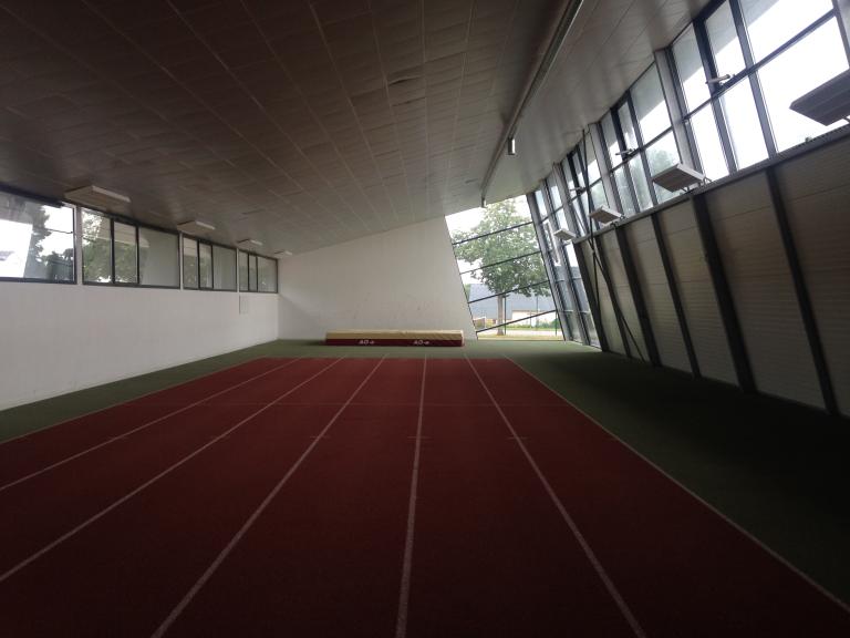 La halle de sports de 1982 est un équipement standard de 80 m x 40 m à charpente en lamellé-collé et bardage métallique, principalement dévolu au tennis. Les travaux entrepris en 2009 ont juxtaposé sur son flanc sud une piste de vitesse couverte de 80 mètres, comportant six couloirs et une aire de saut, permettant l’organisation de compétitions indoor. Par ailleurs, un poste de chronométrage a été établi à l'arrivée de la piste extérieure et le bâtiment des vestiaires, à l'extrémité sud-est du site, a été restructuré de façon à accueillir une salle de musculation.