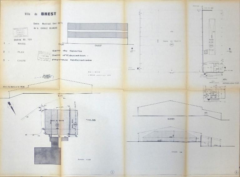 Le 18 décembre 1973, le conseil municipal choisit le modèle Guillou (halle dépouillée et annexes) pour le centre sportif de la Cavale Blanche. Le projet bénéficie d'un arrêté d’approbation technique le 16 décembre 1974 et d'un arrêté de subvention de 350 000 F au taux de 41,33% le 28 février 1975. Le permis de construire est signé le 4 août 1975 et le marché de gré à gré avec l'Entreprise du Centre passé le 29 septembre. L'architecte d'opération est H. Auffret.