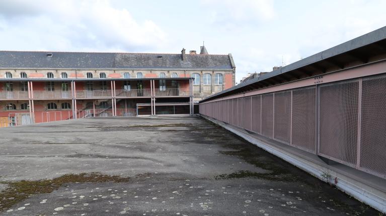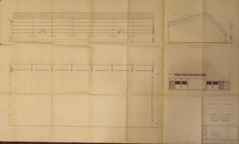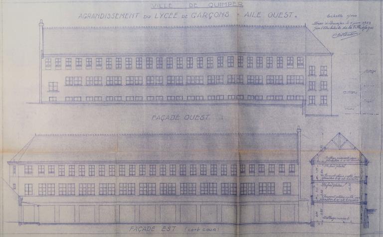 Dans son "Étude sur les lycées" publiée en 1883 dans l'Encyclopédie d’architecture, Paul Gout indiquait : "Les dimensions du gymnase couvert peuvent un peu varier avec l’importance du lycée ; toutefois, on doit leur assigner un minimum de 8 à 10 mètres de largeur sur 16 ou 20 mètres de longueur. Ses dépendances consistent en une ou deux salles pour l’escrime, la boxe ou la canne, et une pièce pour le dépôt des fusils. » (p. 26) Celui qu'il réalisa à Quimper respecte ces dimensions et est largement éclairé à l'est et à l'ouest par six grandes baies en arc segmentaire.