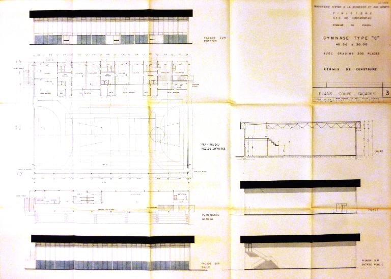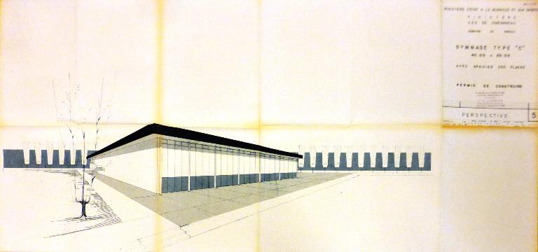 Gymnase de type C 40 m x 20 m avec gradins de 300 places, les locaux annexes étant situés sous ceux-ci. Ossature métallique. Remplissage des pignons en parpaings et murs rideaux sur les façades principales.