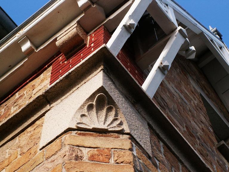 -Granit sculpté : motif floral sur un pan coupé, nom de la villa sur un cartouche.