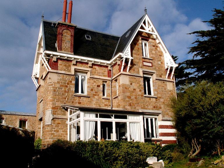 La silhouette de l'ensemble est élancée. Sur la rue du Grand Large, l'élévation présente une décoration allant dans ce sens: bow-window (aujourd'hui déposé) donnant un aspect de vitrail, linteaux à larmier, mur-pignon comportant des chanfreins arrêtés par un motif, ferme débordante couronnant l'étage en surcroît aux boiseries découpées d'arabesques. L'élévation sur la plage propose une lecture plus nuancée, bien dans l'esprit de l'éclectisme: le mur du rez-de-chaussée présente l'alternance de bandes de briques et d'enduit clair, référence au style anglo-normand, et, rappel subtil, le couvrement de la baie du deuxième étage est ici un arc aux claveaux de brique, alors que son homologue coté rue est un linteau en granit ; des modillons soutiennent les chéneaux, eux-mêmes ornés de motifs floraux relevés sur les villas pompéiennes.