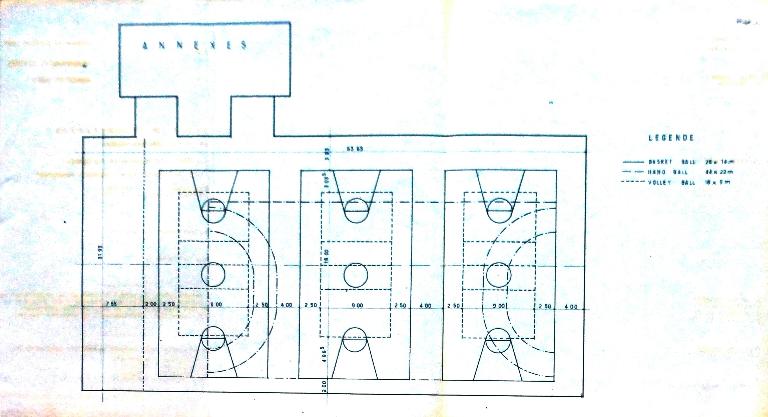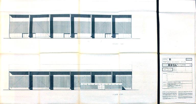 Il s'agit d'une halle de sports conçue par les architectes L. Miquel et A. Wogenscky avec l'entreprise Durafour, type HD2A de 32 x 64 m avec structure métallique, issue du concours lancé en juillet 1964 par le secrétariat d'Etat à la Jeunesse et aux Sports. La couverture en tôle laquée présente un plan incliné d'est (H. 12,40 m) en ouest (9 m) et repose sur des poutrelles métalliques. A l'origine, bardage "simple peau" constitué de tôles laquées et de plaques fibro translucides doublées à l'intérieur de la salle par des plaques en contreplaqué. A l'ouest de la halle, un petit bâtiment de plain pied abrite vestiaires, sanitaires et locaux techniques.