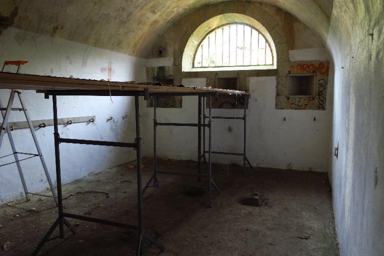La distribution intérieure du corps de garde reprend celle du plan-type. Les pièces de part et d'autre de l'entrée accueillent la cuisine (à droite) et les chambres du chef de poste et du gardien (à gauche). La citerne est présente sous les pièces de l'entrée. La première grande travée est partagée entre le magasin aux vivres (à droite) et une chambrée de troupe, séparées par une cloison disparue qui s'appuyait sur l'escalier droit menant à la terrasse, lui aussi disparu. Les deux autres grandes travées sont des chambrées de troupe. Des éléments témoignant des dispositions prises pour le casernement au 19e siècle y sont toujours visibles : crochets sur les murs et trous dans le sol des poteaux supportant les barres pour les hamacs, pitons des planches à bagages au-dessus des couchages, conduits des poêles. Des noms allemands sont inscrits au-dessus des crochets de la première travée. Les trois pièces du fond correspondent aux deux magasins à poudre séparés par le magasin d'artillerie.