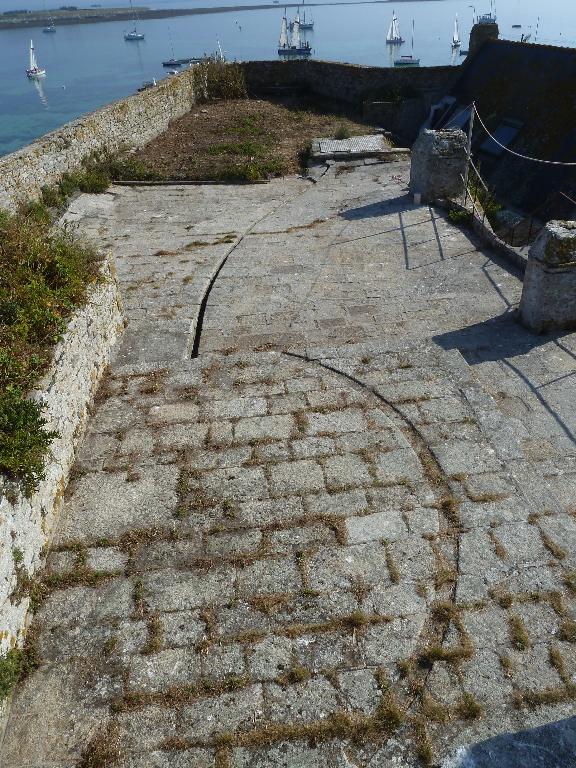 "La gauche de la batterie proposée sera sur le prolongement de la face droite du phare et à 50 mètres en avant, les pièces seraient dirigées partie sur le mouillage, partir sur la pointe de Trévignon ; elles seront défilées, par une traverse en capitale, des feux du large. Une tour n° 1 affectée à la défense de la batterie et contenant un poste de 20 hommes d'infanterie, sera en même temps le réduit de l'île ; elle sera placée à 100 mètres à droite et en arrière de l'épaulement de la batterie, de manière à être couverte des feux du large par la crête du plateau sur lequel s'élève le phare. La batterie sera reliée au réduit par un mur qui devra être bien flanqué et précédé d'un fossé".