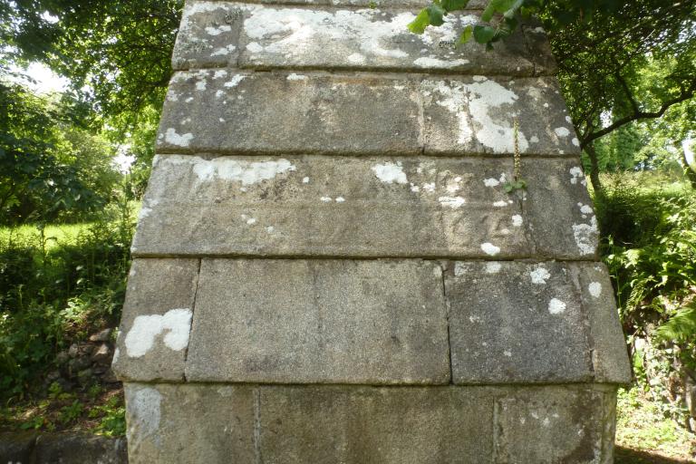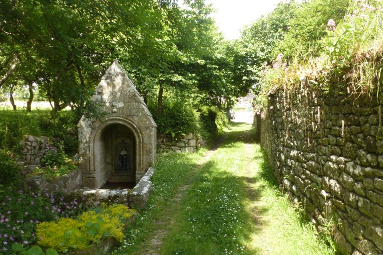On doit sa construction à IAN LE BIS (recteur d’Esquibien entre 1633 et 1669) dont le nom, accompagné d’un calice en saillie, surplombe l’ouverture et apparait également sur le mur sud de la chapelle. Le second nom présent sur l’édicule est porté sur le pan est du toit : MARTIN : LE : PEVOCH : FAB.