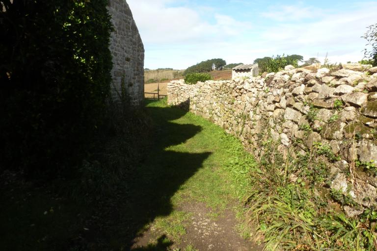 L’intérieur du logis offre une arrière cuisine très bien conservée : on observe sur le pignon ouest une cheminée dont les jambages consistent en deux murs droits et sous le fenestreau du mur sud, une succession de deux étagères murales aménagées au-dessus d’une auge à eau (ou saloir ?) monolithe. Chose rare, on peut également observer le « banc à vaisselle » (bank ar skotachou) en pierre. Ce dernier n’a pas été déplacé et occupe sa place habituelle : il est positionné perpendiculairement au mur sud et présente sur ses côtés sud et ouest un chanfrein soigné. Son côté est, normalement caché par le drustuilh (ou le banc dossier), n’est pas travaillé.