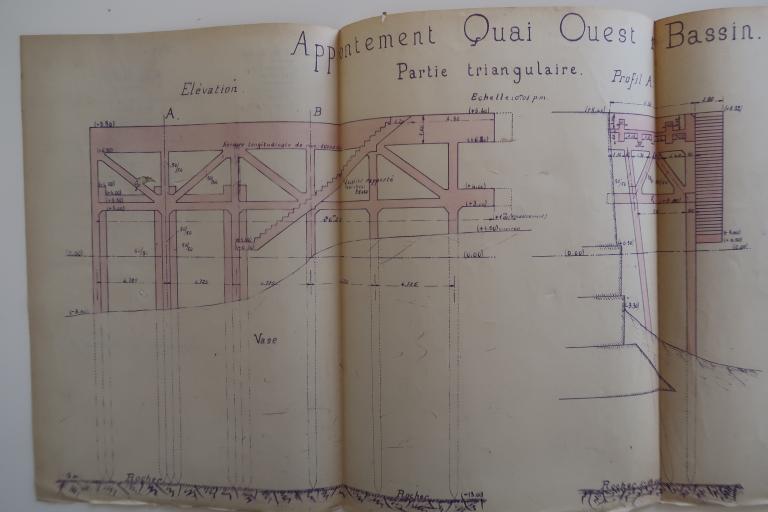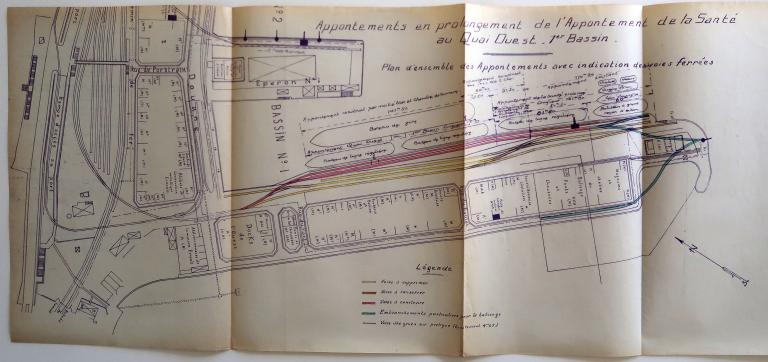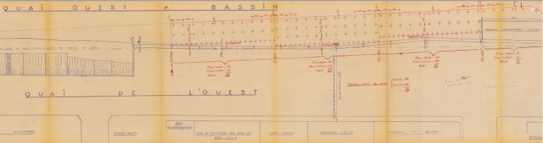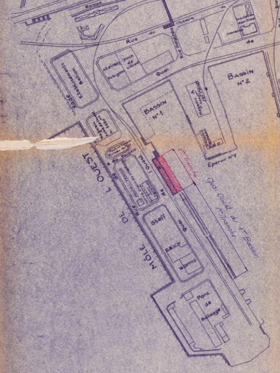 Le 4 juin 1956, le service finistérien des Ponts et Chaussées (arrondissement de l'Ouest ; ingénieur Piquemal) lance la procédure de marché par appel d'offres pour la reconstruction de la partie nord (60.20m) du quai ouest du 1er bassin du port de commerce de Brest ; la partie sud (154.70m) du quai ayant fait l'objet d'une première phase en 1954.