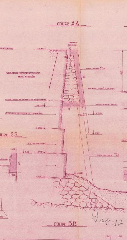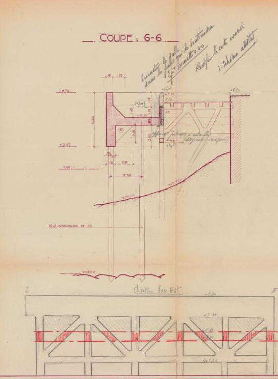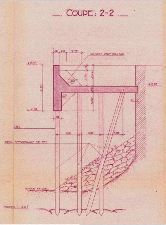 Différents documents contenus dans les notes de calcul (bureau d'études A. Hestaux 20/12/1956) précisent l'implantation des pieux, le coffrage de la dalle, le ferraillage des poutres et dalles et autres indications concernant la surcharge envisagée (tonnes/m²). Les plans ont été dressés en juillet 1954 par l'entreprise parisienne ANT. Levaux et fils. Les pieux en béton armé ont été coulés et implantés (degrés différents) selon les recommandations des Ponts et Chaussées incluses dans le marché public. Les photographies de 1956 du suivi de chantier de la seconde phase sont les témoins de cette mise en œuvre. Chacune des parties reconstruites est séparée par un joint et prend appui sur les vestiges des fondations du quai poids de 1862.