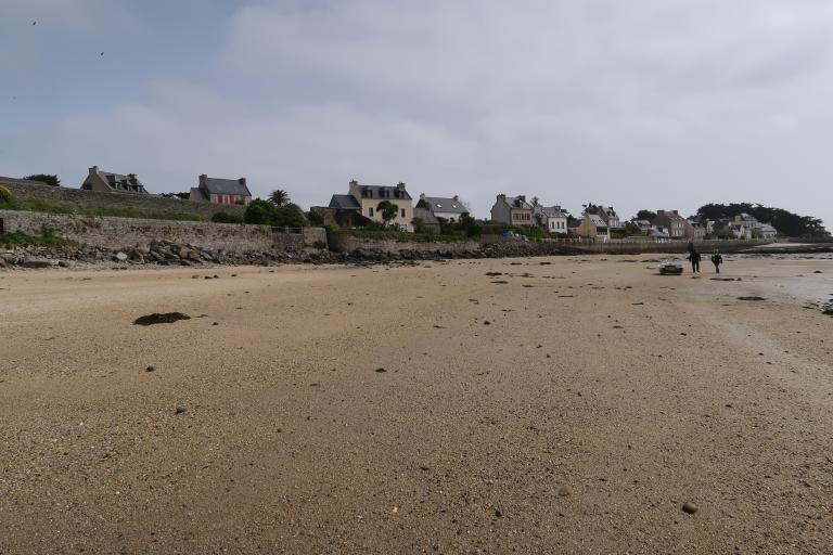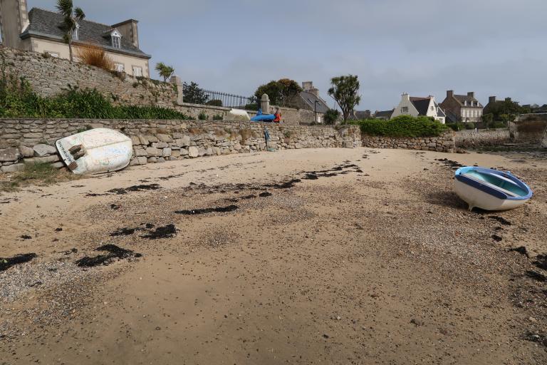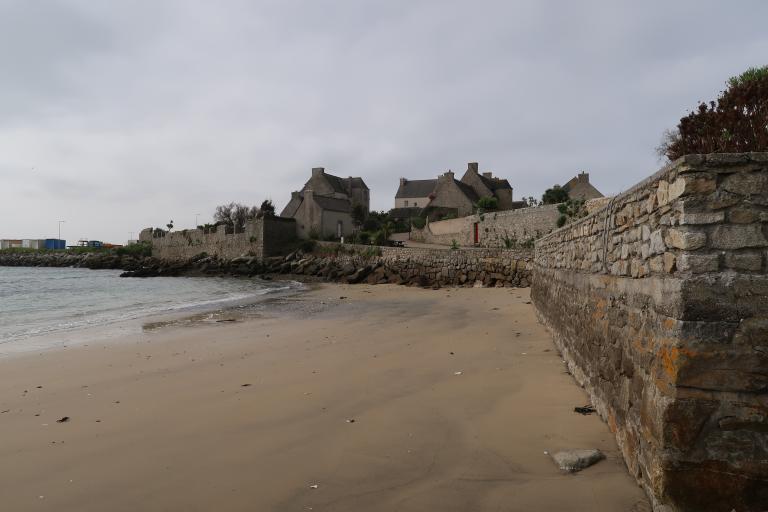 -haut de plage de Roc'higou (Pors an eog) : mur poids en maçonnerie ; escalier ; petite cale incluse dans le mur de soutènement en maçonnerie ; mur chasse-mer maçonné ; soutènement ouest et est composé d'enrochements naturels protégeant le talus.