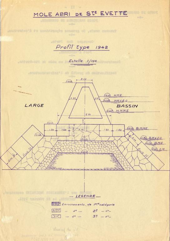 Le môle de Sainte-Evette a pour fonction de former un port-abri avant-port d'Audierne. Il protége aussi le chenal d'accès, en atténuant l'effet des vagues. Sa construction par l'entreprise Limousin débute en 1940 et se termine en 1952 après une pause durant la guerre. La force des vagues affectent l'infrastructure. En effet, dès les années 1967, le déplacement des blocs risberme est constaté.