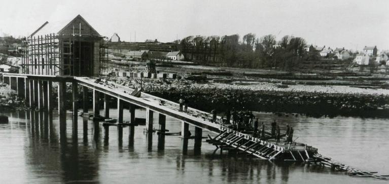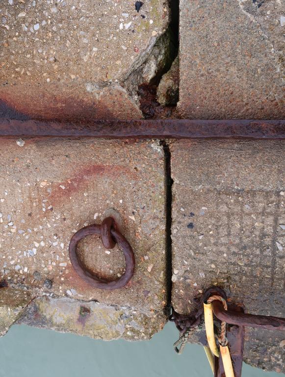 Poutres encastrées sous dalle en béton armé sous l'abri du canot ; supportant 24 tonnes ; pieux en béton armé.