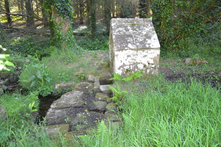 On observe devant la fontaine un aménagement dallé qui permet à la fois de se rendre au bassin et de canaliser l’eau qui en sort. Notons également la présence d’un bénitier (?) à proximité de ce bassin.