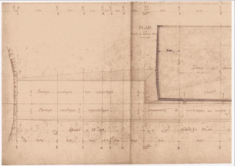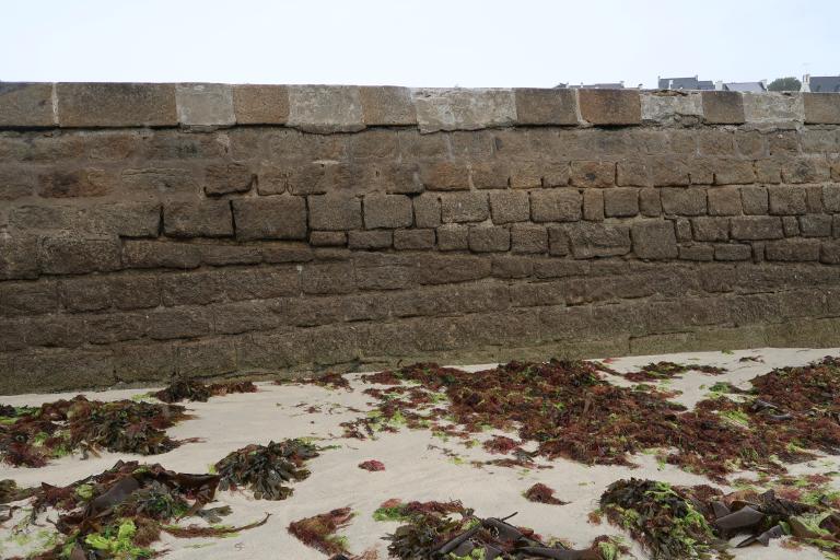 Digue ou cale-débarcadère en maçonnerie de moellons remplie de pierres sèches ; le niveau du platelage a été modifié pour combler une cale située sur le côté nord de la digue ; musoir-construit suite à la suppression de la cale-en pierres de taille ; mur poids Considère ; dalle en béton sur la partie aval ; escalier et échelles côté nord ; escalier côté sud.