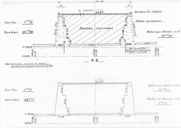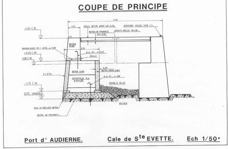 Cale en béton armé constitué d'un mur poids en béton à redans avec remblais à l'intérieur : alvéole de 5*5m avec remblais (de tout venant en partie haute ; de carrière en partie basse), dalle béton en couverture ; rehaussée et allongée en travaux complémentaires.