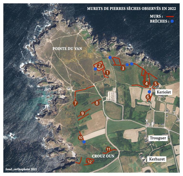 Il est toutefois certain qu’hormis les murets récents ou fortement remaniés liés à l’aménagement d’une zone touristique à la fin du 20e siècle (parkings ou chemins piétons aménagés), une forte majorité des ouvrages observés en 2022 renvoient à des limites de parcelles tracées sur le cadastre de 1836. Quelques-uns pourtant ont été observés autour du village et du four à pain de Keriolet et n’apparaissent pas sur ce cadastre. On peut penser qu’ils sont contemporains des bâtiments proches (2e moitié du 19e siècle).