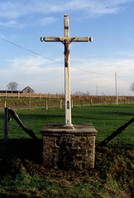 Croix de bois sur socle maçonné dont les angles sont ornés de briques à perles et à petits créneaux ; niche creusée dans la hampe ; Christ en croix en fonte peinte en blanc.