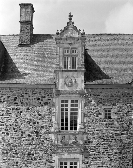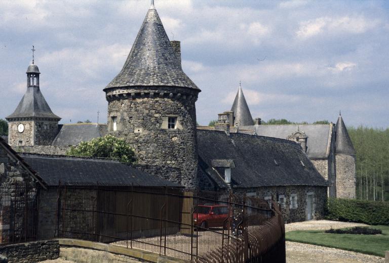 Typologieschâteau de plan en équerre, à chapelle d'attache, hagioscope, élément de défense, bouche à feu ; rhabillage. Néo-Renaissance