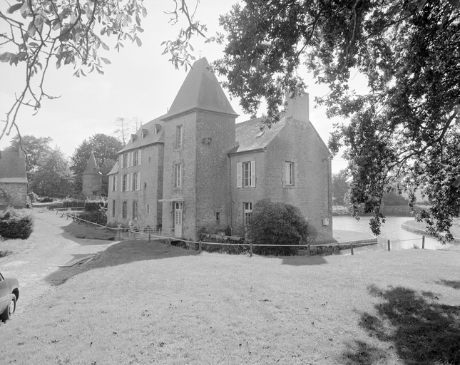 Logis construit sur une terrasse rectangulaire bordée de douves qui se transforment en étang à l'ouest.