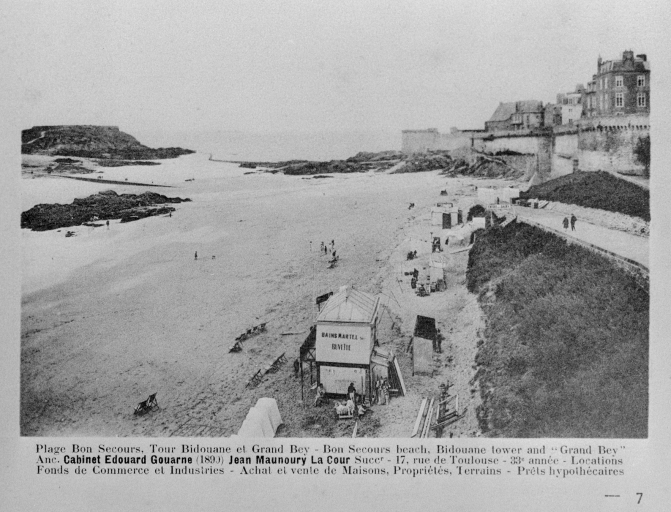 La création du premier établissement de bains sur la plage de Saint-Malo en 1840, puis l'arrivée du chemin de fer en 1864, ouvrent l'ère des bains de mer dans la région malouine. Les premiers bains de mer sont pris sur la grève des Bains au pied des fortifications, sur les conseils du docteur Chapel, qui suscite avec un rapport d'hydrothérapie de 1840 la création de la société anonyme des Bains de Mer de Saint-Malo, dirigée par M. Midy. Les bains s'organisent en saison autour de l'établissement de bains de mer chauds appelé premier casino. Les cabines mobiles sont remisées sur la cale de la Porte Saint-Thomas, à proximité de la place Chateaubriand où se réunit dans les cafés et autour du kiosque à musique la société mondaine. La plage de Bon-Secours, qui se trouve à l'ouest des fortifications, n'est accessible que par la ville close et comporte également dès 1851 un établissement de bains de réputation familiale, voire modeste. En 1868, la Société des Bains de Mer fait construire un deuxième casino sur le terre-plein à l'extrémité ouest du Sillon. Sa construction à proximité de la place forte de Saint-Malo implique une concession spéciale des autorités militaires ainsi qu'une obligation de construire un édifice en bois. A partir de 1870, plus de trente ans après les premiers bains, quelques villas, des immeubles et des hôtels (villa Kervarech, hôtels Franklin et Petit Franklin, Emeraude Palace, Jacques Cartier) sont construits en front de mer sur le Sillon pour des propriétaires malouins, remplaçant peu à peu les bâtiments industriels liées aux chantiers de construction navale. Un essor de la construction se produit alors à Saint-Malo, en dehors des murs, avec la construction de chalets sur la chaussée du Sillon élargie. Les quartiers balnéaires de Saint-Malo sont reliés à la station concurrente de Paramé par le tramway et par la digue des Dunes. Avec Saint-Servan, les liaisons se font par le pont roulant qui traverse plusieurs fois par jour les écluses du port. Pendant la Seconde Guerre mondiale, beaucoup de villas sont réquisitionnées et souvent remaniées intérieurement. Le troisième casino de Saint-Malo est bombardé en 1944 et reconstruit en 1956, sur le même emplacement. La plupart des villas sont aujourd'hui divisées en appartements.