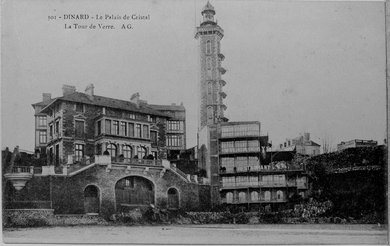 Sur la Côte d´Émeraude, comme dans de nombreuses stations balnéaires, les nouvelles techniques constructives deviennent des attractions touristiques à part entière, attirant une population de curieux. A Dinard, la station est lancée depuis 1868 et s´enorgueillit depuis cette date de nombreux équipements en tous genres. La villa Crystal édifiée en 1892, sur la « grande plage » de Dinard, par l´architecte présumé Emile Liège, était un édifice à la fois original, moderne et spectaculaire. Original par l´utilisation précoce de matériaux nouveaux tels que le verre pour des surfaces vitrées particulièrement importantes, le béton pour séparer les différents niveaux et le fer pour la structure et les bastingages des multiples terrasses. Moderne par son dessin et son esthétique nouvelle, elle était composée, à l´origine, de deux volumes principaux de trois niveaux chacun, décalés et superposés de façon orthogonale. Cette volumétrie quasiment cubiste sera reprise par les architectes modernistes du 20e siècle. Elle était enfin spectaculaire par l´adjonction d´une tour belvédère, haute de 45m, qui ressemblait davantage à un phare et qualifié de Tour Eiffel de Dinard par son ascenseur permettant de découvrir en plusieurs haltes les curiosités de la roche et du panorama. Comme beaucoup de ces folies architecturales non conçues pour durer, elle est démolie en 1977 en raison de son mauvais état de conservation.