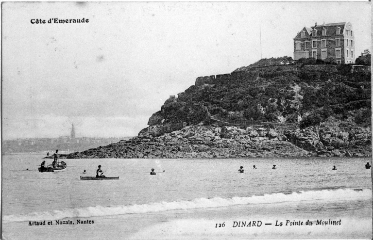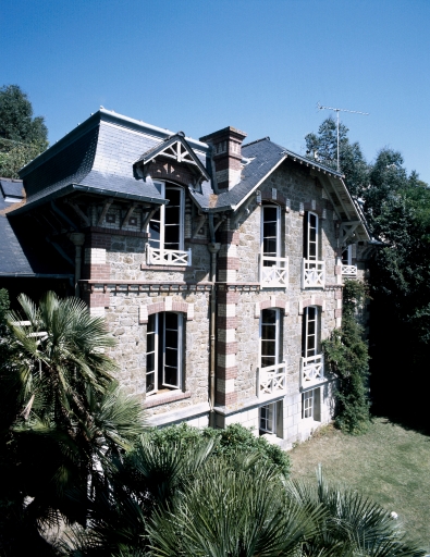 La villa Saint-Germain, anciennement appelée villa Mortemart, du nom de son constructeur, fait partie des habitations importantes de la ville balnéaire de Dinard. Son implantation exceptionnelle sur un site de promontoire qui domine à la fois l´embouchure de la Rance et la principale plage font de cet endroit un lieu privilégié de villégiature. Les nombreuses cartes postales éditées de cet endroit dévoilent étape par étape la subtile métamorphose du logis et la transformation de la végétation littorale en un jardin paysager. L´architecture de la villa, édifiée aux alentours des années 1870, était sensiblement différente de celle d´aujourd´hui. La construction, composée de trois volumes imbriqués et décalés ne possédait pas encore la silhouette élancée du château à la française qu´affirment les hautes toitures du pavillon d´angle, aménagé au début du 20e siècle. Au contraire, l´influence stylistique de cette première habitation semblait plutôt venir des modèles d´Outre Manche. Le désir d´être en contact permanent avec la nature environnante est dès l´origine privilégié au détriment des principes esthétiques français. L´articulation savante des différents corps était étudiée pour permettre à chaque pièce de bénéficier d´un point de vue sur l´océan. L´utilisation précoce des bow-windows et des fenêtres à guillotines qui diminuent la prise du vent, ainsi que la proportion initiale du comble brisé sont les indices d´un savoir-faire plus anglo-saxon que local. Les volumes dissociés par des toitures indépendantes étaient articulés autour d´un vestibule central. Les façades en moellons de granite avec des assises alternées de brique étaient dépourvues d´ostentation superflue. L´évolution de cette maison de villégiature, à connotation britannique, vers le château de bord de mer à la française s´est faite de façon progressive par des modifications de toitures et des agrandissements dont un corps supplémentaire en 1926 contenant un escalier d´apparat rampe sur rampe, formant hall d´entrée, tel qu´il était d´usage dans les demeures prestigieuses de la région au XVIIe siècle, et d´un office permettant une communication directe avec la salle à manger. Un portail de la deuxième moitié du XVe siècle est également mis en place en 1930 à l´entrée de la propriété et la rapproche encore des demeures de l´ancien Régime.