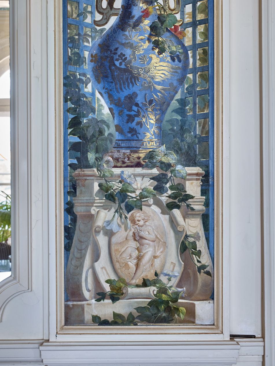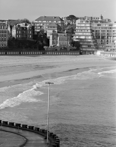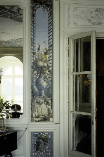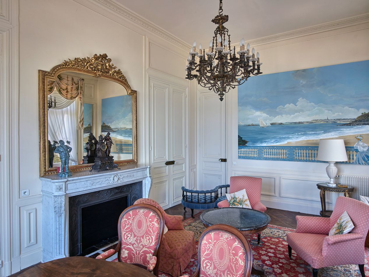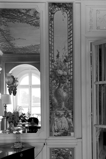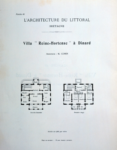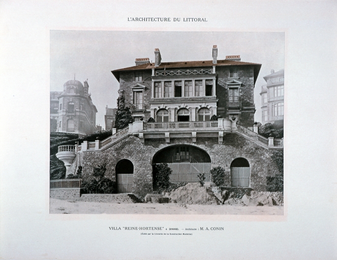 Cette villa de style palladien, qui domine l´extrémité ouest de la grande plage de Dinard, fut construite vers 1900, par l´architecte parisien Alphonse Conin, ainsi que deux autres pavillons en symétrie de part et d´autre de l´entrée sur la rue de la Malouine. Le soubassement monumental de l´édifice, socle largement ouvert par un grand arc surbaissé, encadré de deux autres en plein cintre plus petits, les volées d´escalier qui convergent au centre vers un avant-corps formant belvédère, les gardes corps en fonte ornementale, réemplois ou réédition de modèles des années 1830, l´inscrivent dans une longue tradition de la villégiature patricienne, particulièrement représentée sur les lacs italiens. Le parti architectural choisi, celui de la villa rustique à l´italienne, original dans le contexte éclectique et pittoresque de la station, s´explique sans doute, par le désir du commanditaire, l´énigmatique russe Vlassov. Celui-ci souhaitait recréer l´ambiance du château d´Arenenberg, sur les bords du lac de Constance, lieu d´exil d´Hortense de Beauharnais, afin d´abriter des meubles et objets ayant appartenu à cette princesse napoléonide, à laquelle il vouait, dit-on, une véritable dévotion. Au rez-de-chaussée, face à la mer, l´avant-corps du salon à baies en plein cintre, est séparé de la partie principale de la pièce par trois arcades qui déterminent une sorte de véranda fermée dont le sol, traité en terrazzo bordé de mosaïque, permet un usage de jardin d´hiver. Un papier peint à treillages factices, qui se prolonge également sur les plafonds, rehausse les pilastres qui scandent les murs, dans l´esprit des fabriques de parcs du XVIIIe, et rattache ce salon aux décors en vogue sous le Second Empire dans la haute société, comme l´étonnante « salle-à manger-serre » conçue par la princesse Mathilde pour son hôtel parisien de la rue de Courcelles. Sur le mur opposé à la mer, quatre trumeaux étroits ornés de vases fleuris sur piédestaux, tous différents, ajoutent au raffinement de ce programme décoratif, certes moins coûteux que des peintures en manière directe, mais dont l´impression, « à la planche », nécessite autant de passages que de couleurs. Les glaces qui garnissent les panneaux face à la mer ainsi que les trois doubles portes du salon accentuent cette illusion d´un espace ouvert, traité à la manière d´un jardin intérieur . Des dessus de portes en plâtre moulé, de style Louis XVI, un parquet d´assemblage à la Versailles complètent cet ensemble, synthèse d´un certain art de vivre à la française, dans lequel se reconnaît le monde du Gotha, style international adopté par la société élégante de la Belle Epoque abonnée des différentes rivieras. Dans ce contexte, un poêle de céramique polychrome, orné de balustres et d´entrelacs, caractéristique du renouveau des formes traditionnelles de l´art russe, au tournant du 19e et du 20e siècle, rappelle ici en bonne place, les origines du commanditaire.