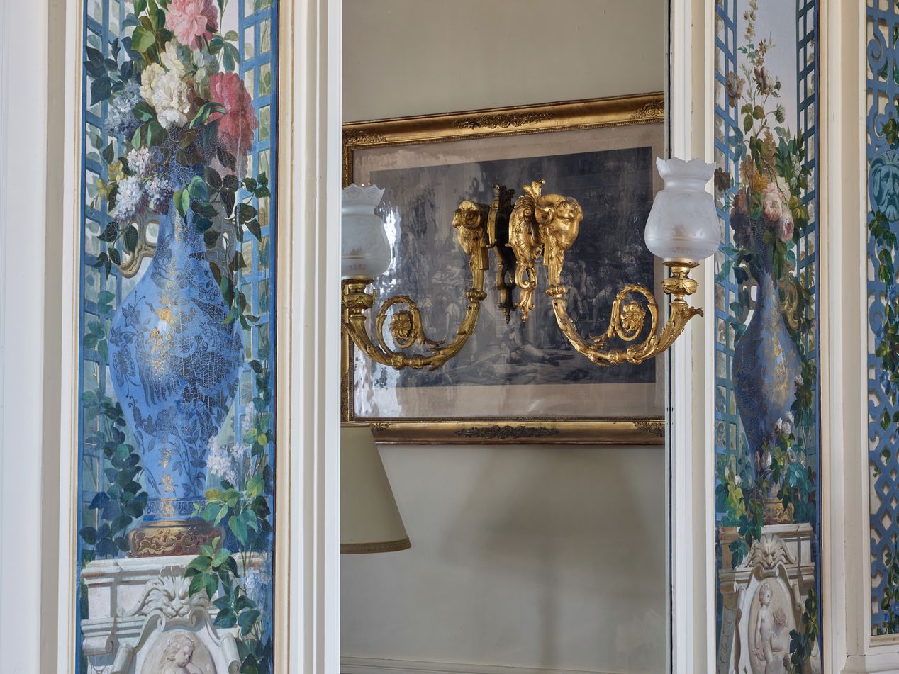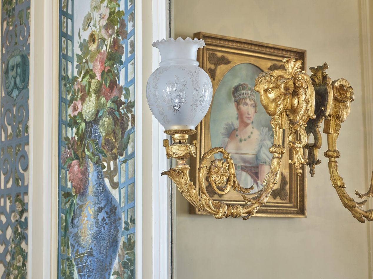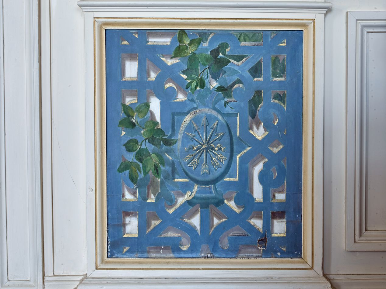 Cette villa de style palladien, qui domine l´extrémité ouest de la grande plage de Dinard, fut construite vers 1900, par l´architecte parisien Alphonse Conin, ainsi que deux autres pavillons en symétrie de part et d´autre de l´entrée sur la rue de la Malouine. Le soubassement monumental de l´édifice, socle largement ouvert par un grand arc surbaissé, encadré de deux autres en plein cintre plus petits, les volées d´escalier qui convergent au centre vers un avant-corps formant belvédère, les gardes corps en fonte ornementale, réemplois ou réédition de modèles des années 1830, l´inscrivent dans une longue tradition de la villégiature patricienne, particulièrement représentée sur les lacs italiens. Le parti architectural choisi, celui de la villa rustique à l´italienne, original dans le contexte éclectique et pittoresque de la station, s´explique sans doute, par le désir du commanditaire, l´énigmatique russe Vlassov. Celui-ci souhaitait recréer l´ambiance du château d´Arenenberg, sur les bords du lac de Constance, lieu d´exil d´Hortense de Beauharnais, afin d´abriter des meubles et objets ayant appartenu à cette princesse napoléonide, à laquelle il vouait, dit-on, une véritable dévotion. Au rez-de-chaussée, face à la mer, l´avant-corps du salon à baies en plein cintre, est séparé de la partie principale de la pièce par trois arcades qui déterminent une sorte de véranda fermée dont le sol, traité en terrazzo bordé de mosaïque, permet un usage de jardin d´hiver. Un papier peint à treillages factices, qui se prolonge également sur les plafonds, rehausse les pilastres qui scandent les murs, dans l´esprit des fabriques de parcs du XVIIIe, et rattache ce salon aux décors en vogue sous le Second Empire dans la haute société, comme l´étonnante « salle-à manger-serre » conçue par la princesse Mathilde pour son hôtel parisien de la rue de Courcelles. Sur le mur opposé à la mer, quatre trumeaux étroits ornés de vases fleuris sur piédestaux, tous différents, ajoutent au raffinement de ce programme décoratif, certes moins coûteux que des peintures en manière directe, mais dont l´impression, « à la planche », nécessite autant de passages que de couleurs. Les glaces qui garnissent les panneaux face à la mer ainsi que les trois doubles portes du salon accentuent cette illusion d´un espace ouvert, traité à la manière d´un jardin intérieur . Des dessus de portes en plâtre moulé, de style Louis XVI, un parquet d´assemblage à la Versailles complètent cet ensemble, synthèse d´un certain art de vivre à la française, dans lequel se reconnaît le monde du Gotha, style international adopté par la société élégante de la Belle Epoque abonnée des différentes rivieras. Dans ce contexte, un poêle de céramique polychrome, orné de balustres et d´entrelacs, caractéristique du renouveau des formes traditionnelles de l´art russe, au tournant du 19e et du 20e siècle, rappelle ici en bonne place, les origines du commanditaire.