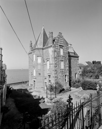 Implantation en front de mer sur une grande parcelle délimitée par une terrasse à contreforts. Logis avec pignons à redents. Façade ouest avec tour d'escalier demi-hors oeuvre couverte d'un toit polygonal. Façade est à galerie en bois. Un château d'eau, situé à l'est de la parcelle sur un promontoire, était actionné par une pompe à énergie éolienne. Communs situés à l'ouest face au logis. Escalier extérieur d'accès à la plage.