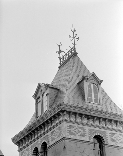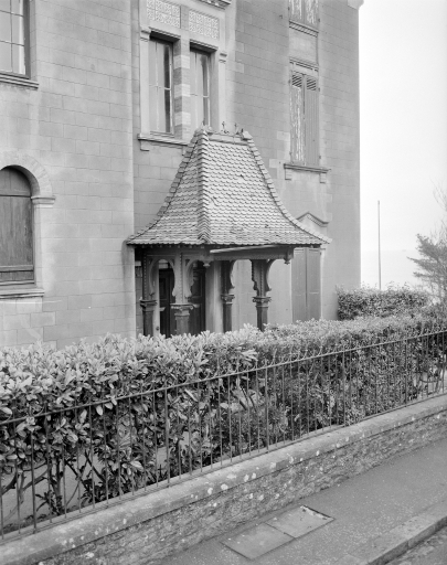 Façade antérieure avec décrochement de la tour d'escalier couverte d'une toiture en pavillon. Entrée abritée par un porche à couverture en tuile ronde vernissée. Gros oeuvre avec parement en pierre artificielle. Brique décorative polychrome dans la partie supérieure de la tour. Frise en céramique sous la corniche.