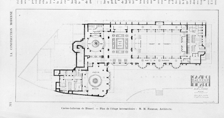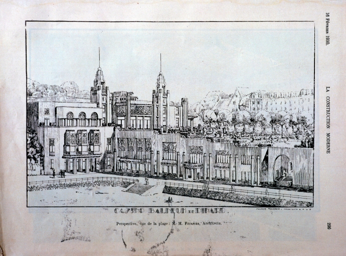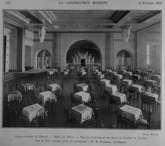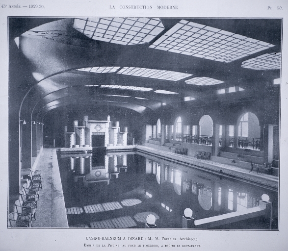 Le casino Balnéum de Maurice Fournier construit en 1928, dans l´angle de la plage de L´écluse, était un signal fort teinté d´exotisme par ses minarets, clin d´œil à l´architecture mauresque et coloniale. L´emploi massif du béton armé, les surfaces blanches et lisses, les toits en terrasses, les larges baies vitrées de formes très variées l´inscrivaient cependant dans le sillage de l´exposition des arts décoratifs de 1925. Les murs extérieurs étaient très peu ornés, seule la colonne cannelée encadrait les grandes baies de la salle de jeux et l´entrée du casino. Eloge de la modernité par son programme architectural il l´était tout autant par la qualité de ses prestations ludiques et sportives. S´y retrouvaient dans un seul lieu tous les agréments que l´on attend d´une station balnéaire renommée, des salles de jeux et de spectacles mais surtout une piscine d´eau de mer chauffée permettant de prendre des bains toute l´année et de s´adonner au plaisir du sport. Ces bassins de natation conçus comme une véritable attraction étaient éclairés la nuit et entourés de galeries dont l´une faisait office de salle de restaurant. Le décor bleu et or des bassins avait été réalisé par Isidore Odorico, mosaïste virtuose du moment. La distribution indépendante du casino et du balnéum était pensée de façon pratique et hygiénique. On accédait au casino par le boulevard du Président Wilson où un espace de parcage des voitures avait été aménagé le long de la terrasse du balnéum. Tandis qu´une entrée latérale pour la piscine, plus discrète, était accessible par un escalier extérieur qui reliait de façon commode la digue, la piscine et le boulevard.