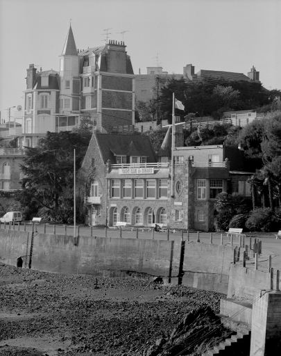 Construit en 1932 par l´architecte Yves Hémar sur un emplacement littoral stratégique, le yacht-club de Dinard, proche de l´ancien port est situé sur le parcours de la promenade au Clair de Lune. Il offre en rez-de-chaussée des vestiaires spacieux, accessibles par des arcades autrefois ouvertes, une bibliothèque à l´étage suivie d´un grand salon-bar et d´une salle de bridge. La composition dissociée des volumes correspond à ce programme pluridisciplinaire que l´on retrouve dans la plupart des équipements festifs et sportifs de la station. La façade sur mer, de style régionaliste, reprend également les thèmes chers à l´architecte : intégration du bâtiment dans le site, emploi du granite gris à la mise en œuvre variée, maintien de formes architecturales traditionnelles, pignons découverts de la partie en retour d´équerre, arcs en plein-cintre des arcades donnant sur le quai. Ce bâtiment moderne avec sa terrasse panoramique d´où l´on peut suivre les régates devient un des équipements promotionnels de la station de Dinard qui veut retenir la clientèle aisée.