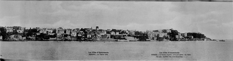 Dinard est la plus importante station balnéaire de la côte d'Emeraude. Son particularisme et son attraction résident en ses deux façades maritime et fluviale. Sa côte Est sur l'estuaire de la Rance a été la première occupée car bien protégée du large, son climat y est privilégié et son paysage unique avec en toile de fond les villes historiques proches, Saint-Malo et Saint-Servan. La côte Nord plus sauvage donne sur la Manche et bénéficie d'un cadre marin exceptionnel avec l'île de Cézembre et le Grand Bé. Dès le début de la villégiature, la clientèle y est très cosmopolite avec une fréquentation anglaise importante, facilitée par les liaisons avec la gare maritime de Saint Malo reliée à Southampton par un service direct plusieurs fois par semaine ainsi qu'avec les autres îles anglo-normandes. C'est d'ailleurs parmi les découvreurs de Dinard, un britannique, Robert Monteith, vers 1850, qui fera partager les beautés de l'endroit aux familles anglaises installées sur le continent, dont la famille Faber connue pour ses premières photographies de Dinard. Ce témoignage exceptionnel du premier Dinard nous dévoile une côte abrupte et rurale sur la plage de l'écluse et nous fait découvrir entre autre, le hameau de pêcheurs sur la Rance, avec ses maisons en moellons de granite aux pignons découverts et aux toitures d'ardoise et de chaume. Ce Dinard paisible et vallonné ne ressemble en rien à la ville d'aujourd'hui surpeuplée à la saison estivale. Elle ne possède pas de plan géométrique défini comme à Paramé, les rues semblent tracées au hasard d'actions ponctuelles. Deux centres rayonnants néanmoins s'y dégagent : la Place de la République qui est aujourd'hui au coeur de l'activité commerçante et la place du Calvaire, proche de l'église de Saint-Enogat qui était le centre primitif de la commune avant la construction de la nouvelle église inaugurée en 1858 et située actuellement Place du Général de Gaulle. C'est à partir de cette date que Dinard, en tant que station balnéaire, prendra son envol. Les premières maisons de villégiature se sont construites au Nord Est sur le site du Bec de la Vallée et en 1859 est mise en service le premier bateau à vapeur . Très tôt, la station acquiert une certaine renommée et attire une clientèle aristocratique. En 1866, le duc Audiffret Pasquier fait construire son château de la Malouine sur les falaises de la plage de l'Ecluse et bientôt se prépare la venue de l'empereur Napoléon III. Bien que ce dernier ne soit jamais venu, les préparatifs liés à sa visite ont joué un rôle moteur pour la médiatisation de la station. Les années 1870 marquent le début de la spéculation immobilière, avec l'arrivée du comte Rochaid Dahdah qui sera le véritable promoteur de cette époque. On lui doit la percée de nombreuses rues du centre ville, la construction de la halle des Aulnaies (détruite) et l'initiative de projets audacieux tels que l'ouverture de la ligne de Chemin de fer Dinan-Dinard qui sera inaugurée en 1887 et la trouée de la porte d'Emeraude qui sera réalisée, plus tard par ses fils. A partir de 1874 1875, Albert Lacroix commence à construire à Saint-Enogat le lotissement des villas de la mer et de nouveaux équipements voient le jour. Les années 1880 1890 sont favorables à la construction d'un nouveau lotissement de luxe : la Malouine qui fait encore la célébrité de Dinard. Quant aux années 1900 1910 elles verront s'édifier également de grands travaux dont le grand casino, l'hôtel Royal et le percement du boulevard Edouard VII. Au lendemain de la première guerre mondiale, Dinard connaîtra à nouveau une période de prospérité, la station possède 4 casinos en 1928 et à cette date s'est construit un hôtel building de luxe : le Gallic Hôtel et des projets grandioses sont dessinés par les architectes Lesage et Miltgen à la Vicomté. C'est aussi le période d'un vaste programme social appuyé par le maire Paul Crolard qui présente un projet tout aussi grandiose de cité jardin s ur les terrains de la Corbinai s et de Saint-Alexandre qui sera très partiellement réalisé. La plupart des digues et promenades sont aménagées également dans les années 20 et 30 avec des piscines extérieures d'eau de mer. La seconde guerre mondiale mettra un terme à la croissance de Dinard et à l'ère des mondanités. Aujourd'hui Dinard s'affiche encore comme une station à connotation anglophile avec son festival du film britannique et s'affirme comme le garant de l'architecture des 19e et 20e siècles avec la mise en vigueur d'une zone de protection de son patrimoine.