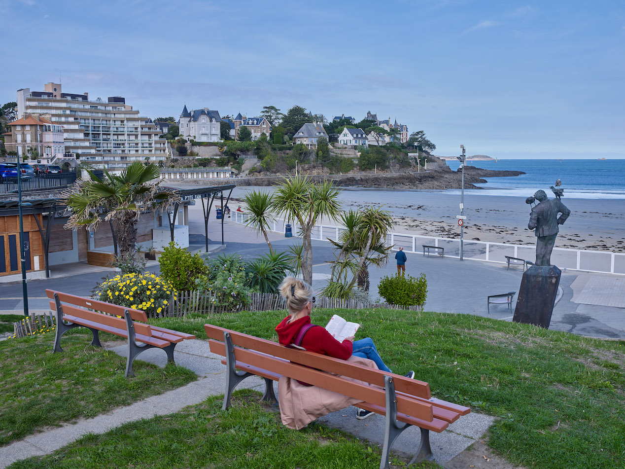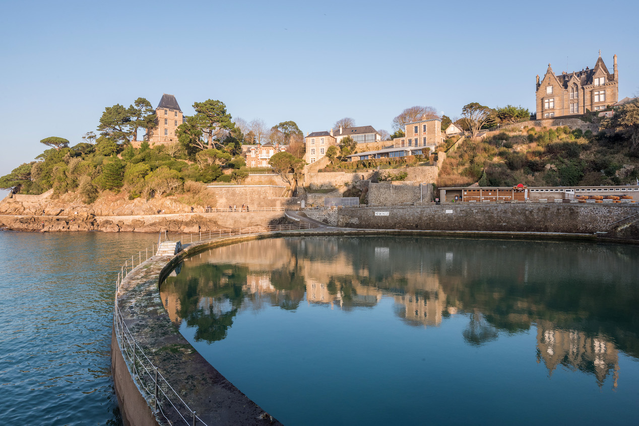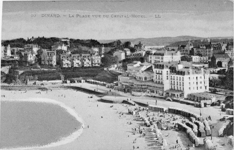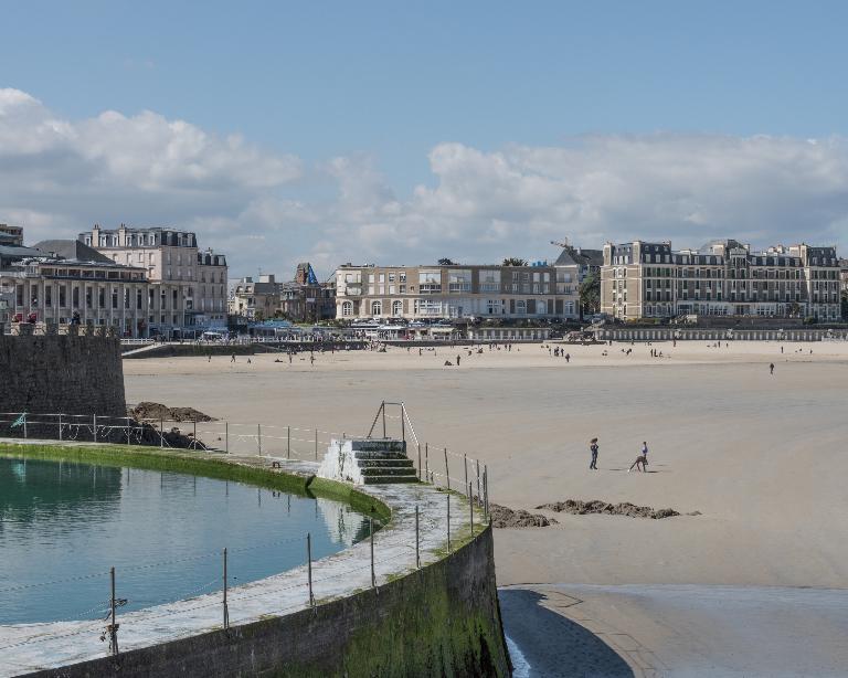 La plage de l'Ecluse, principale plage de Dinard, est devenue depuis le début de la villégiature le cœur de la station balnéaire. Située dans une anse profonde entre les pointes escarpées du Moulinet à l'est et de la Malouine à l'ouest, elle est bordée au sud par une digue promenade. Les différents guides touristiques vantent son sable fin et sa pente douce sécurisante pour la baignade. Un premier établissement de bains y est construit en 1859, puis un casino en bois en 1866. A partir de cette période, la plage devient le monopole des baigneurs et la municipalité y interdit en 1870 l'enlèvement des marnes et du sable utilisés par les agriculteurs de la commune. Le premier hôtel construit directement sur la grève est le grand hôtel des Terrasses en 1889, qui s'adosse au nouveau casino rebâti en 1877. En 1892, est élevée la nouvelle attraction de la plage, la villa Crystal, maison de verre sur plusieurs étages, accompagnée d'une tour en maçonnerie semblable à un phare surmonté d'un belvédère qui sera qualifié de tour Eiffel de Dinard. En 1900, les terrains appelés les squares des Falaises situés à l'ouest de la grève sont vendus à une société parisienne qui y installe en 1902 un palace dit l'hôtel Royal et un nouveau casino dû à l'architecte Blanchet. Un nouvel espace d'agrément est dès lors envisagé par la mairie qui a acheté en 1901 à l'est du casino des terrains vagues afin d'y aménager un square réalisé en 1907. A cette date, une partie de la digue est construite et de nouveaux projets sont en cours. En 1912, une passerelle à l'usage du public est installée dans la partie est de la grève de l'Ecluse, permettant, avant l'ouverture de la porte d'Emeraude, de circuler plus facilement entre le débarcadère du Bec de la Vallée et la plage. Les années 20 et 30 sont également une période de grands projets et de nouveaux aménagements, tels que la réalisation par René Aillerie de la piscine à ciel ouvert et des cabines de bains fixes, du chemin de ronde allant de la plage de l'Ecluse à la pointe du Moulinet et la construction du balnéum de Maurice Fournier avec sa piscine d'eau de mer chauffée permettant de prendre des bains de mer en toute saison. Cet établissement balnéaire de qualité est détruit au profit d'une nouvelle attraction, synonyme de modernité, la piscine olympique qui est inaugurée en juillet 1967. Lui est bientôt adjoint un nouvel édifice municipal en 1973, l'actuel Palais des Congrès.