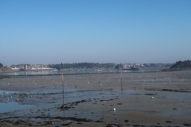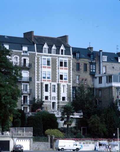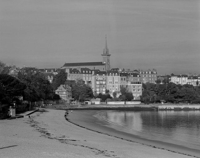 La plage du Prieuré est la deuxième grande plage de Dinard, située sur l'estuaire de la Rance face à la ville de Saint-Servan. Orientée à l'est, elle est plus abritée que sa voisine, plus mondaine, la plage de l'Ecluse. Elle doit son nom à l'ancien prieuré des trinitaires, situé au fond de la baie et fondé en 1324 par les frères Olivier et Geoffroy de Montfort. Ce prieuré transformé en habitation particulière a été occupé dès 1840 par un consul anglais. C'est l'un de ces consuls Robert Monteith qui, fasciné par l'endroit, a fait découvrir Dinard à la colonie anglaise de Dinan, dont les Faber. A côté du prieuré, se sont établies dans les années 1860 les soeurs de la charité de Bayeux dont certains guides mentionnent les cabines de bains abritées sous les arbres de leur jardin. Elles cèdent en 1871 leur établissement aux trinitaires de Valence qui y installent un pensionnat de jeunes filles. Le quartier de la plage du Prieuré est également le noyau primitif de la nouvelle ville de Dinard, matérialisé en 1858 par l'église et la mairie-école située au sud du presbytère. C'est aussi le lieu choisi en 1868 par l'architecte Pichot pour y construire la villa Eugénie qui se devait d'accueillir le couple impérial. Quelques villas se construisent à cette période sur les falaises, dont la villa Pontlevoy avec ses jardins en terrasses. Plus tard, vers les années 1880, la famille Klekosky construit en retrait du front de mer la villa Nahan, véritable château, aujourd'hui détruite, dont le parc a été en partie sauvegardé. Vers les années 1880-1890, les différences se creusent entre la plage de l'Ecluse, qui devient le lieu à la mode où il faut se montrer, et la plage du Prieuré, tranquille et familiale, fréquentée par les gens du cru. Les années 1930 révèlent les attraits de cette plage avec la création de la promenade au Clair de lune et d'équipements nouveaux, telle que la piscine extérieure.