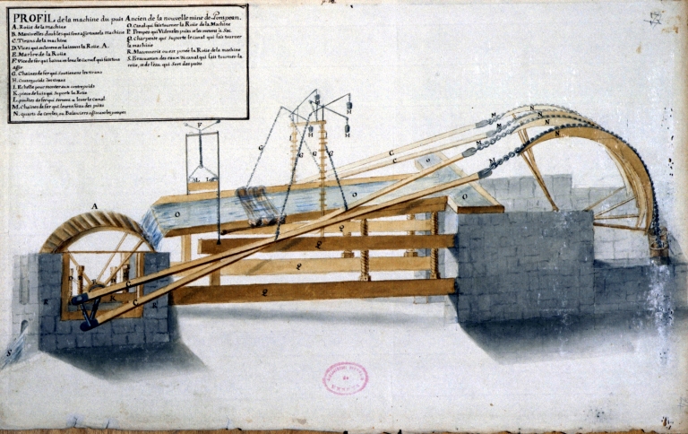 Machine du puits ancien de la nouvelle mine, profil, Robien, marquis de. Description historique et topographique de l'ancienne Armorique, pl. XXII (1735).