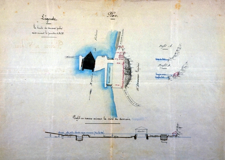 Moulin du Boël, plan de situation et profil en travers suivant la crête du déversoir, AD Ille-et-Vilaine 2Q 552. Domaine de l'Etat 1800-1940. Domaine fluvial : Vilaine, concession temporaire (29 mai 1869).