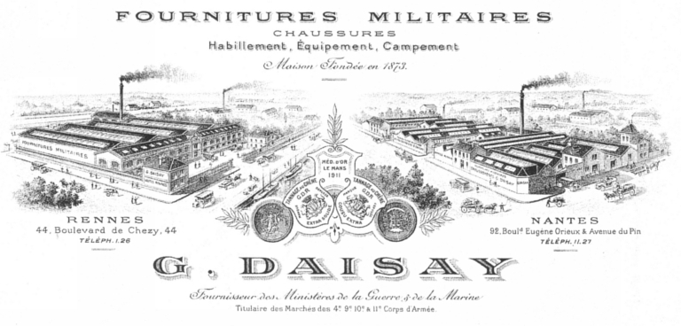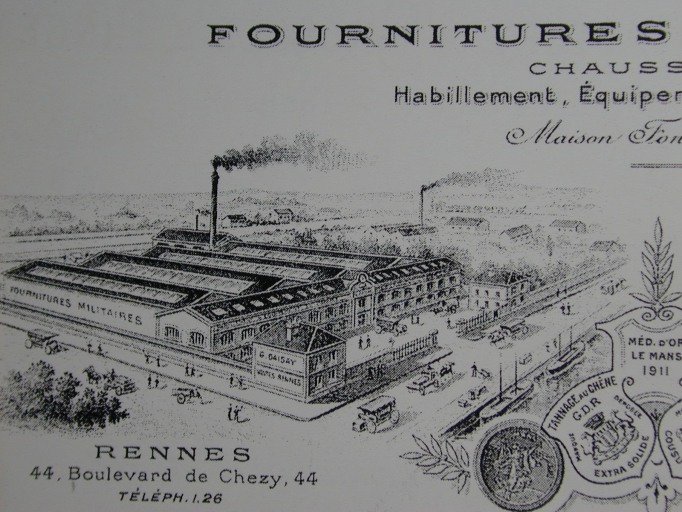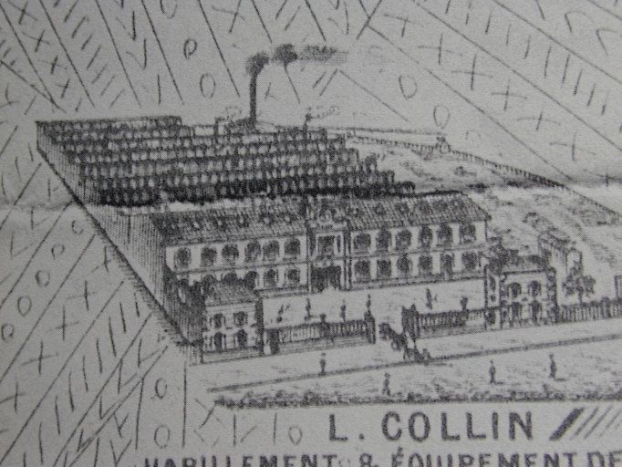 Usine de confection militaire, dite Etablissement Collin, créée en 1873. En 1890, l'usine Collin comprend trois ateliers distincts d'équipement, de chaussures et d'habillement. Durant l'année 1890, le premier atelier occupe un assez grand nombre d'ouvriers grâce à l'importance des commandes traditionnelles et à des commandes supplémentaires obtenues par voies d'adjudication. Dans les ateliers d'habillement et de chaussures, la réduction au minimum des commandes traditionnelles et la suppression par l'Etat des commandes supplémentaires produisent un tel ralentissement du travail que la moitié des ouvriers est congédiée et l'autre moitié a subi une réduction de la journée de travail passant à 6 heures et demi. En 1906, le successeur G. Daisay fabrique toujours des fournitures militaires telles que chaussures, habillement et affaires de campement. En 1912, une succursale est mentionnée à Fougères, 5 pl. du Marché. La date de cessation de l'établissement est inconnue. Aujourd'hui, les bâtiments abritent une école d'architecture.