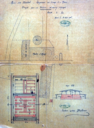 Tuilerie au moulin d'Apigné, plan au sol et coupe transversale, AM Rennes 100W 14. Autorisations de construire, arrêtés de construction, Grand Moulin d'Apigné (23 août 1906).