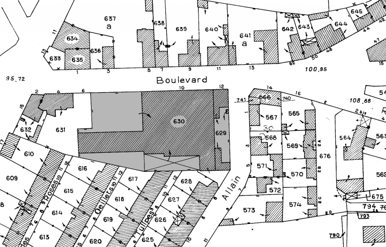 Propriété Réhault, 5 boulevard Charles Tillon, plans de la cave, du rez-de-chaussée et du premier étage, AM Fougères 5J 2-31. Hygiène et santé. Plans de maisons particulières dressés par le bureau d'hygiène, architecte H. Pinel (1924).