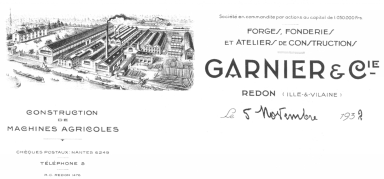 Usine de construction mécanique fondée en 1862 par J. Garnier, alors directeur des importants ateliers de construction de machines agricoles des Trois-Croix, à Rennes (35). Dès ses débuts, l'usine Garnier obtient de nombreux premiers prix dans presque tous les concours où elle se présente et devient rapidement une des plus importantes manufactures de machines agricoles de France. Cet essor s'accompagne de la construction de nouveaux bâtiments. En 1881, un incendie détruit les 3000 m2 de l'usine construite en bois. Transformée en société, l'entreprise Garnier reconstruit l'ensemble de ses ateliers. En 1917-1918, construction d'une nouvelle fonderie. En 1924, construction d'une halle d'expédition de machines agricoles mesurant 100 m de long sur 80 m de large desservie par un pont roulant électrique. L'usine est spécialisée dans la fabrication des pressoirs montés, vis de pressoir avec appareils de serrage, broyeurs de pommes, fouloirs à vendange, hache-paille, moulins à farine agricoles, batteuses, aplatisseurs de grains... En 1937, elle fabrique la première moissonneuse-batteuse. Dans les années 1940, les magasins et ateliers s'étendent sur plus de 4 ha. Durant la guerre, l'usine travaille pour la Défense nationale. La société se développe, modernise la fonderie et crée des filiales avec la Fonderie du Châtelet en 1945, à Redon, FAO à Vitré (35), succursale de la maison mère redonnaise et Mabille-pressoir à Amboise (37). La société Garnier exporte vers l'Europe, l'Afrique du Nord et l'Amérique latine. En 1962, nouvelle extension de l'usine. Mais en 1967-1968, l'entreprise connaît des difficultés dues à la vétusté des machines et au manque de moyens financiers qui aboutissent, en 1970, au dépôt de bilan et à un règlement judiciaire. Après plusieurs tentatives de redressement, la fermeture définitive a lieu le 25 août 1980. Actuellement, les bâtiment sont en partie réhabilités par diverses entreprises. En1863, une machine à vapeur de 8 ch est attestée dans l'atelier de scierie mécanique. En 1925, l'usine emploie deux cent soixante dix salariés, près de cinq cents en 1950 et sept cent soixante quatre en 1970.