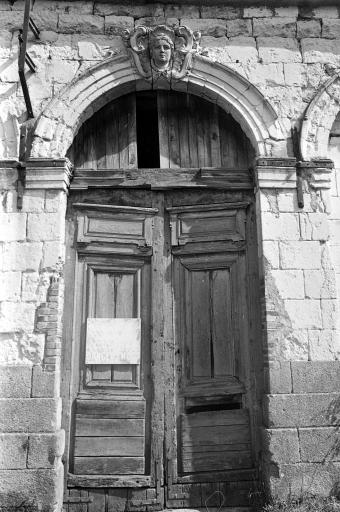 Ouverte d´une porte (de dimension importante) à arc surbaissé (linteau de bois) ; les piédroits sont en granite, harpés ; pilastres d´angle, coyaux apparents, corniche. Reste de la façade : appareil de brique.