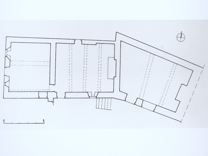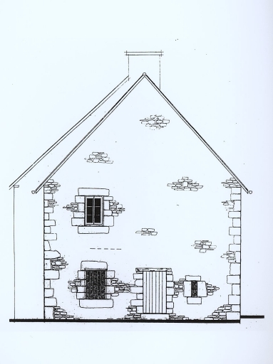 Structure : vaisseaux et étages ; étage carré Couverture : toit à longs pans ; pignon couvert Distribution : escalier droit, hors oeuvre Décor : armoiries (illisibles) sculptées sur le linteau à l'angle supérieur droit d'une porte ; armoiries (3 meubles) sculptées sur une pierre au dessus d'un linteau de fenêtre au rez-de-chaussée ; armoiries (une bande) sculptées sur le linteau d'une fenêtre à l'étage ; croix de section octogonale enchassée dans la façade antérieure.